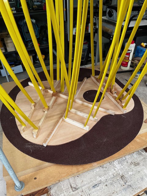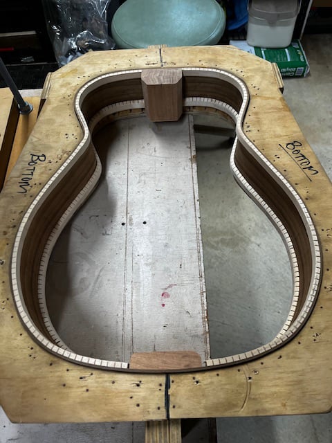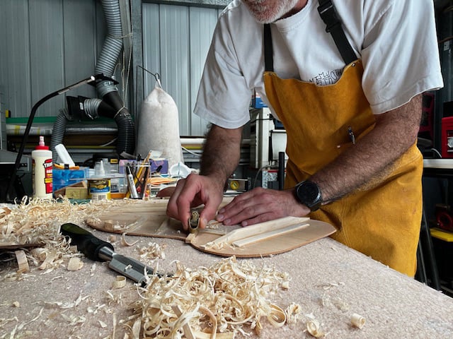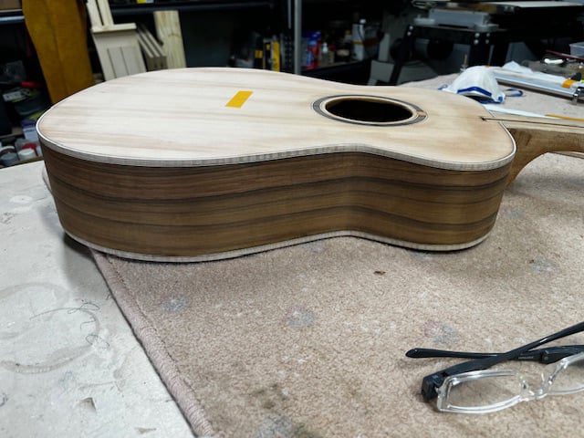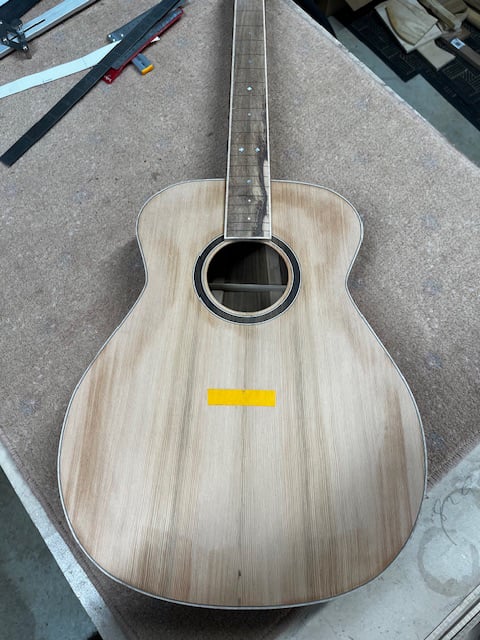 The brief was simple. Other than the sound board, everything else had to be recycled tone wood, including an native Olive fingerboard.