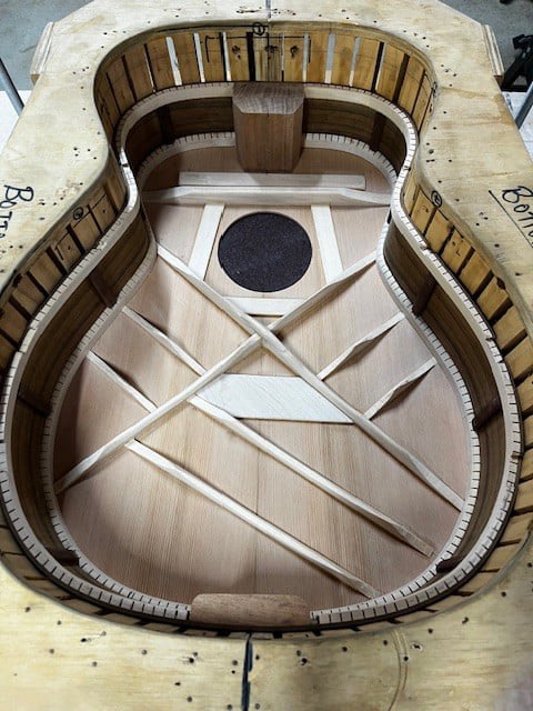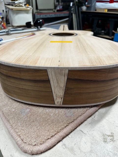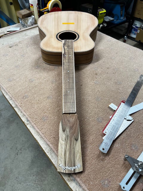 Caleb's Guitar: An OM guitar in the style of an early D18 Martin. The guitar uses native Australian recycled tone wood back and sides (Tasmanian Blackwood) and a North American Spruce top. The rest of the guitar will be built using native species such as 90 year old Jarrah, and recycled Queensland Maple.